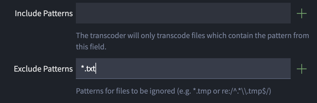 Example: If you want to prevent .txt files from being transcoded, simply add *.txt to the exclude field.