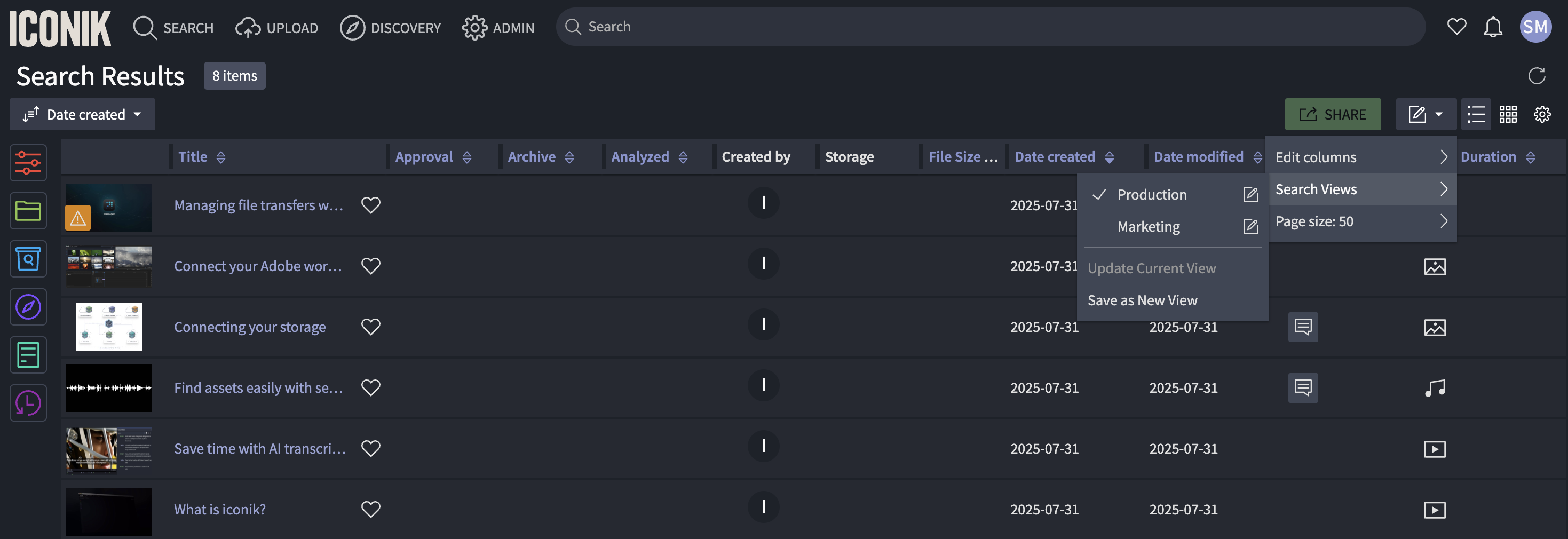 Available to all users, Search Views allow you to customize and save the way you view your assets and collections on the Iconik Search page. Tailor your layout—choose the exact columns, column order, width, and sorting preferences—then save it as a reusable view for easy access any time.