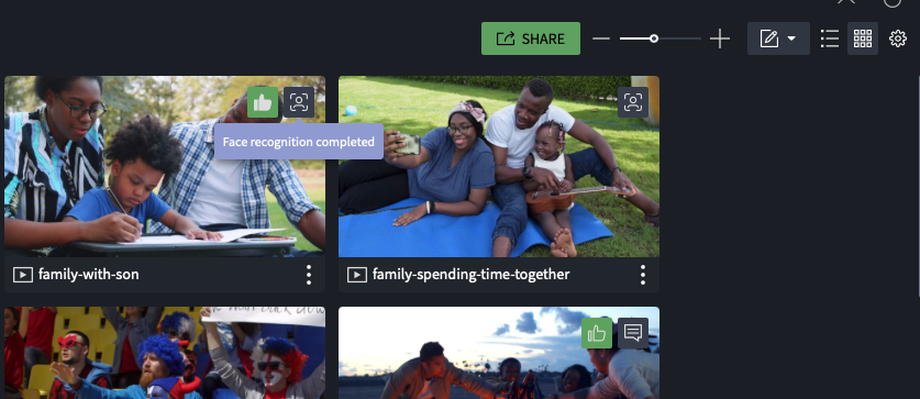 - In the grid view, the face recognition status is displayed in the top right corner of the thumbnails.