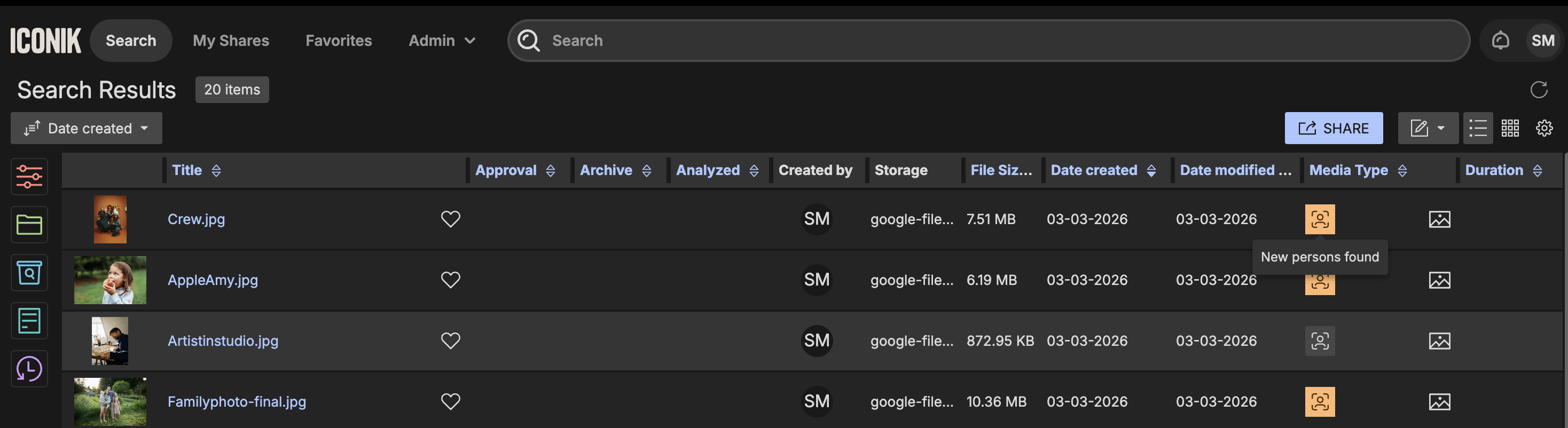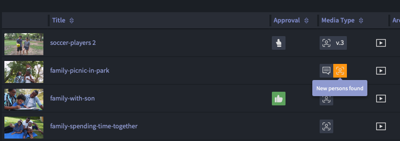 - In the table view, check out the Media type column to get an overview of assets with new persons detected or face recognition completed.