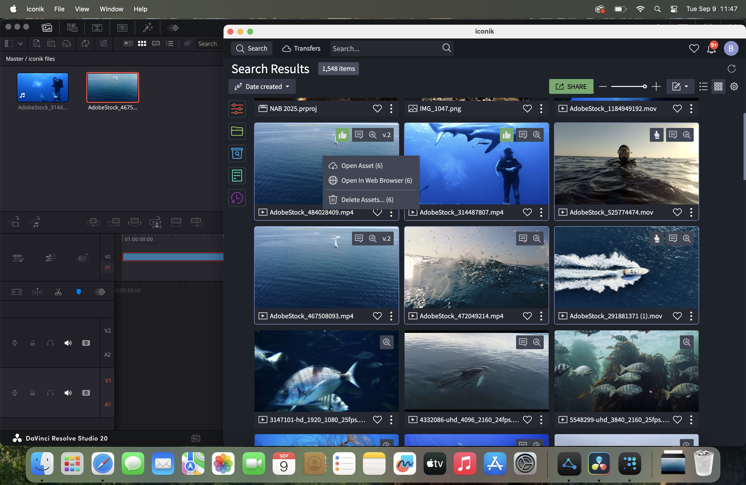 From the Iconik panel inside DaVinci Resolve, you can import original assets and collections directly into your project. Multiselect is supported, but you cannot mix assets and collections (or multiple collections) in the same import.