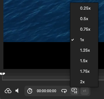 Click the speed indicator (shows current speed, e.g., "1x") to access a menu of preset playback speeds. Choose from the below. The current playback speed is indicated with a checkmark.