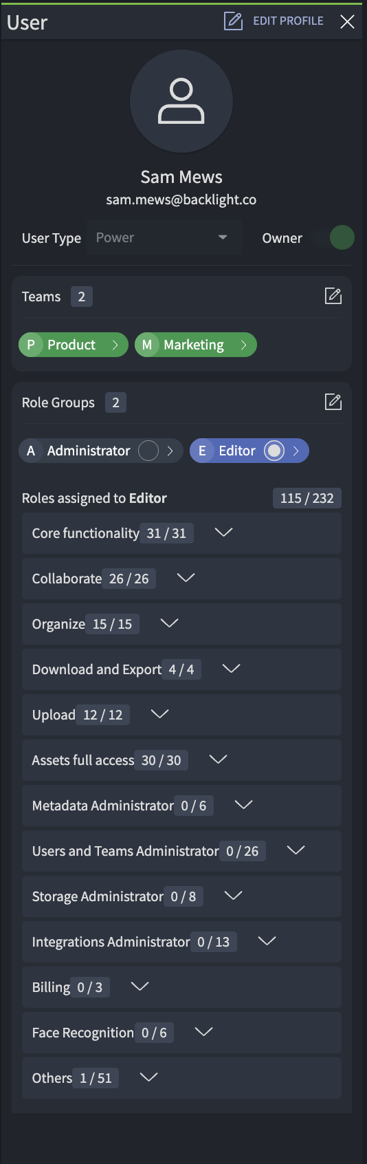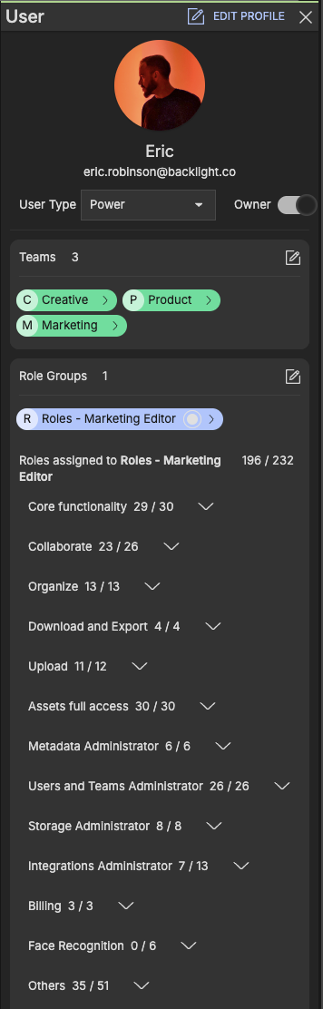 The panel shows all Teams and Role Groups the user belongs to.