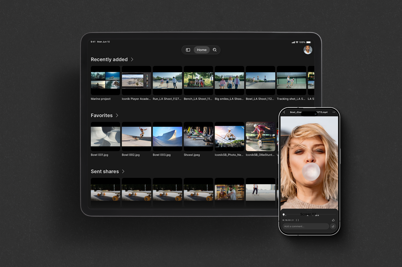 Send assets to clients, stakeholders, or team members, inside or outside your organization. Receive shared media from others and jump straight into review. Comment and annotate directly from the app.