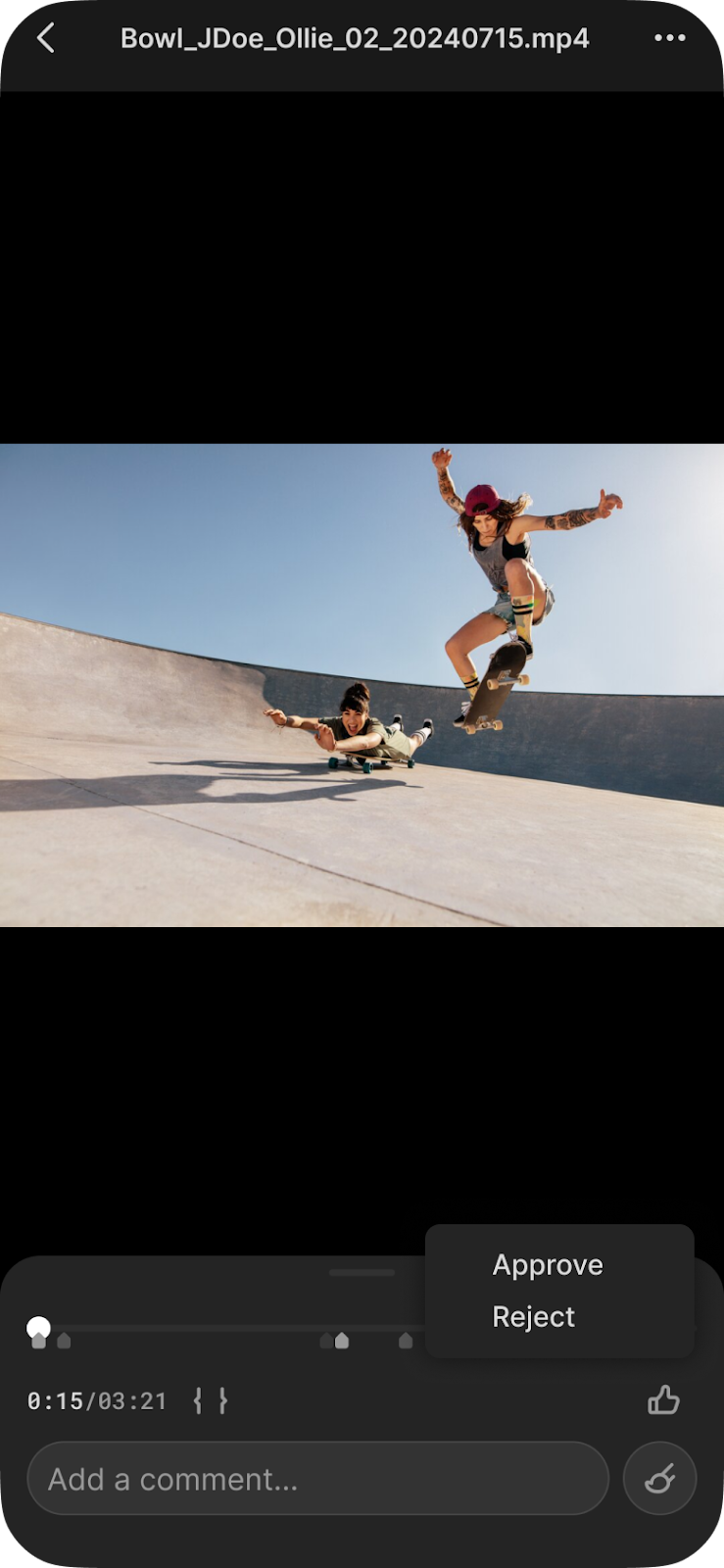 From the asset page it is possible to Approve or Reject by tapping in the top right corner of the comments panel and select Approve or Reject on the following menu.