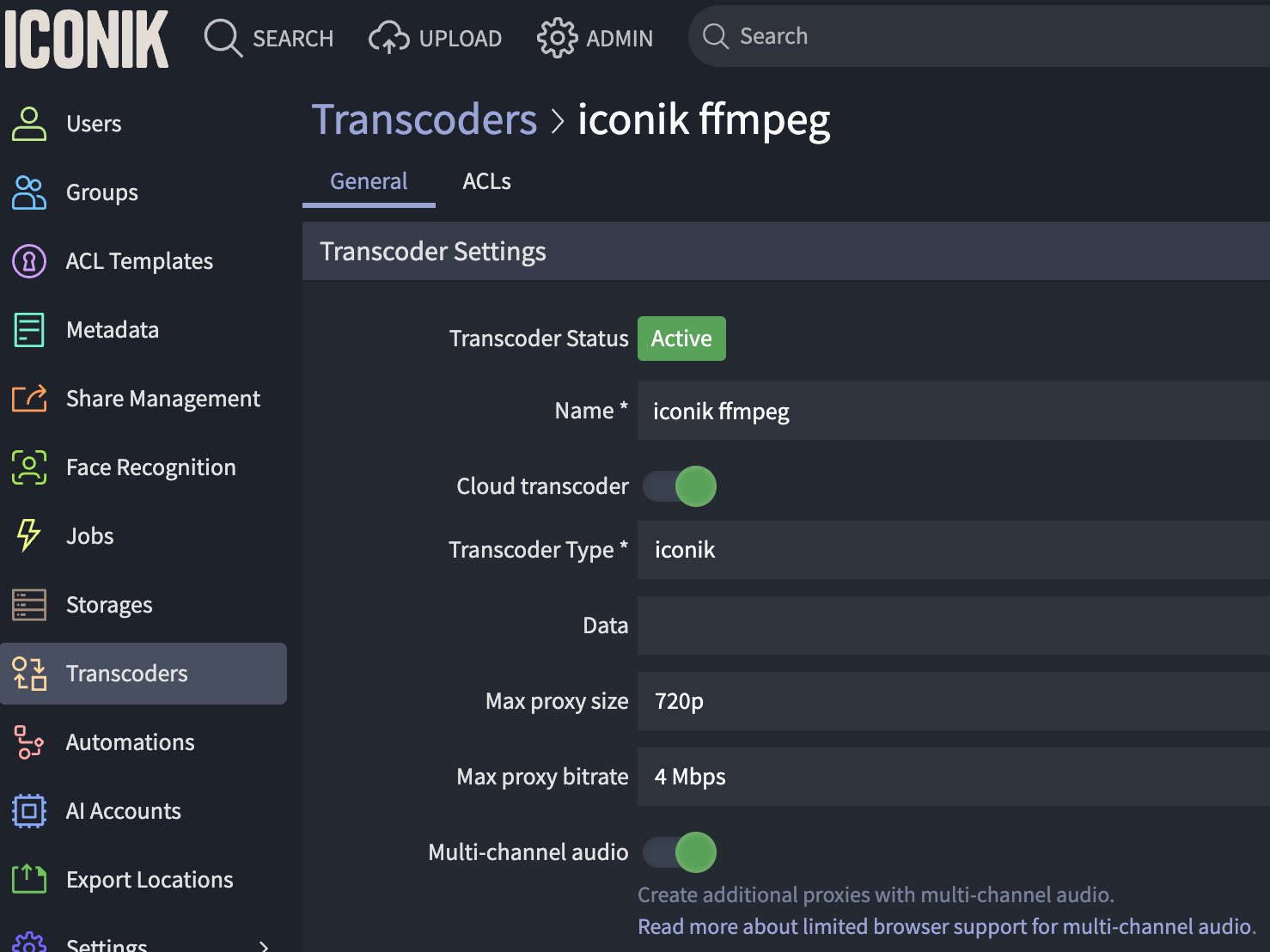 - Select your transcoder (Iconik Cloud Video or ISG) > General