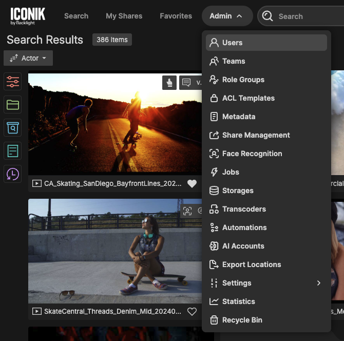 Navigation bar: The navigation bar has been restructured to put your most-used pages front and center. My Shares and Favorites now appear directly in the top navigation for faster access. Admin functions (Users, Teams, Transcoders, Settings, and more) are consolidated into a single Admin dropdown, making them easier to find without cluttering the main nav. The Upload button has been removed from the top navigation; usage data showed that most users upload via drag-and-drop, storage connections, or the Iconik Agent rather than the top nav button. The user profile dropdown has also been expanded to provide easier access to Admin Training and other resources.