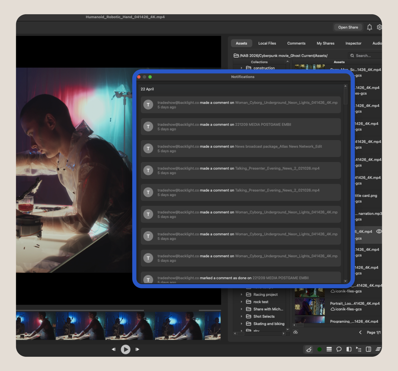You can now open and review image sequences directly in the Iconik Player at full fidelity and framerate. The Player plays through the sequence just as you'd expect, giving you an accurate read on your work inside the same ecosystem where the asset lives, rather than exporting to a separate review tool. The Player also supports color profiles via OpenColorIO, allowing you to view the sequence in the intended color space. When the review is done, the sequence can be published back into Iconik: a high-resolution video render can be generated, and a web proxy is generated automatically for the broader team, and all annotations, comments, markups, and color profiles travel with the asset. From there, you can run a synchronized review session where someone on the proxy in Iconik web and someone in the Iconik Player are locked together in real time: same playhead, same moment, different versions of the file.
